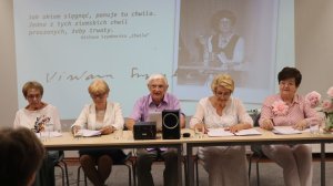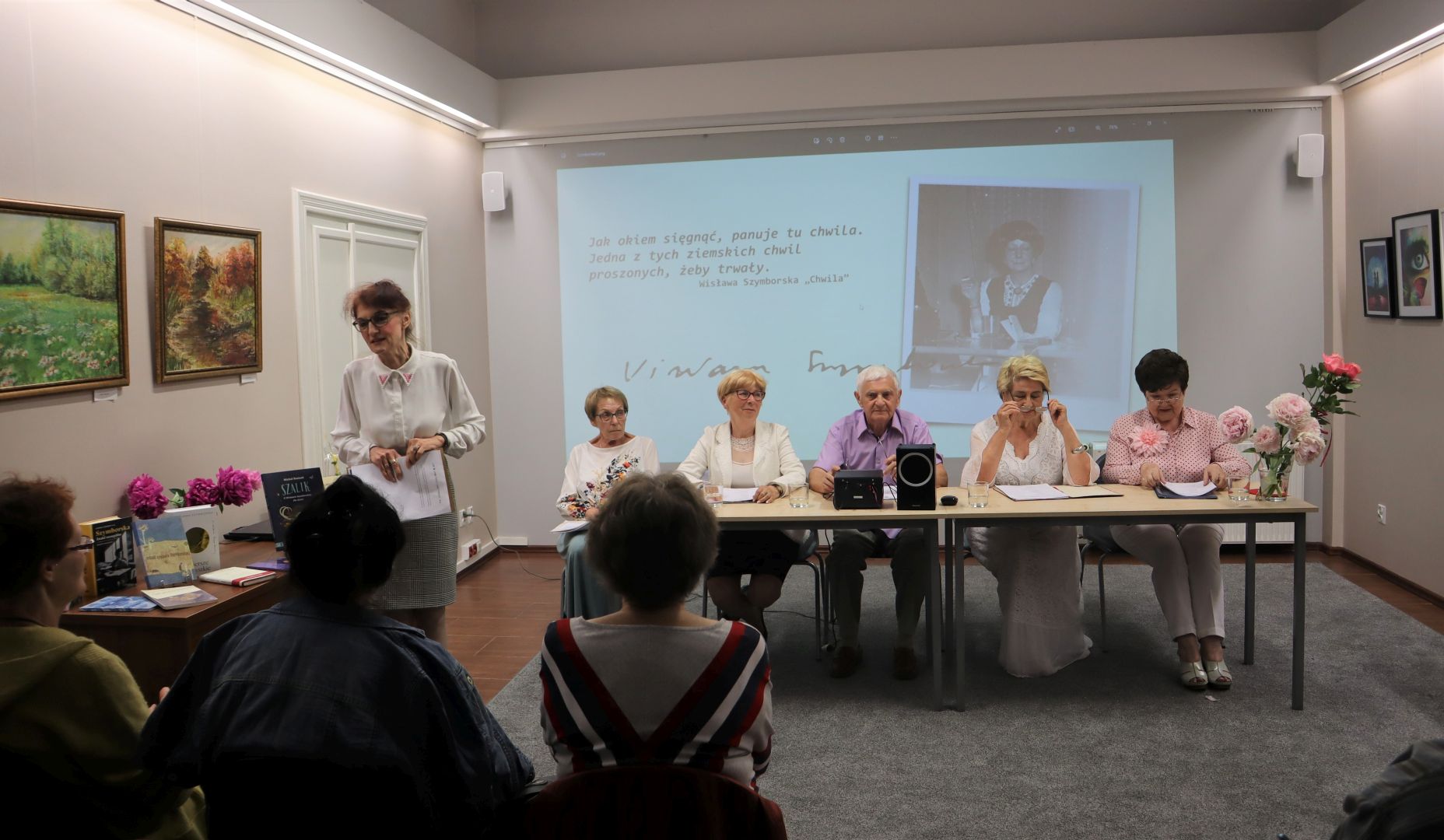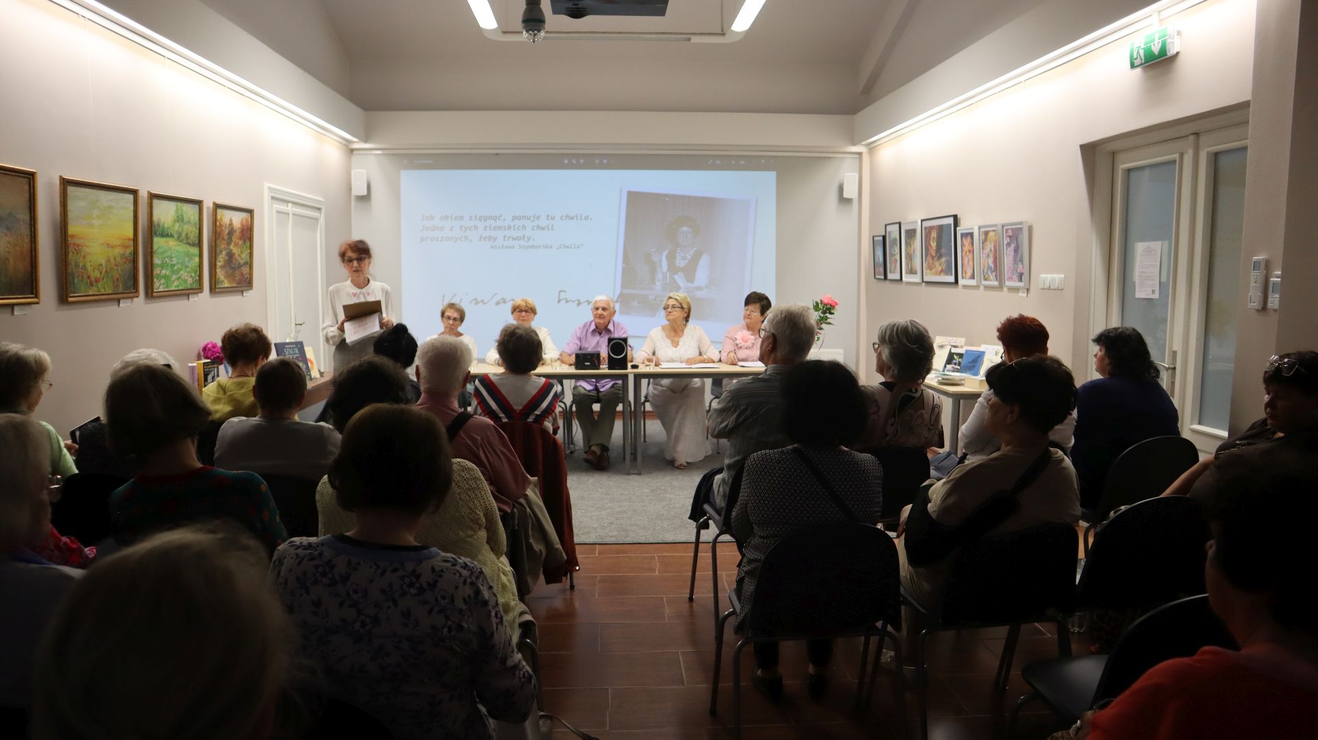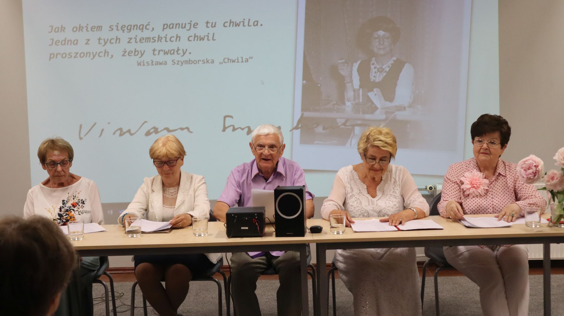 Grafika: Wisława Szymborska i krakowscy literaci na spotkaniu w Miejskiej Bibliotece Publicznej w Andrychowie, źródło: MBP w Andrychowie, domena publiczna